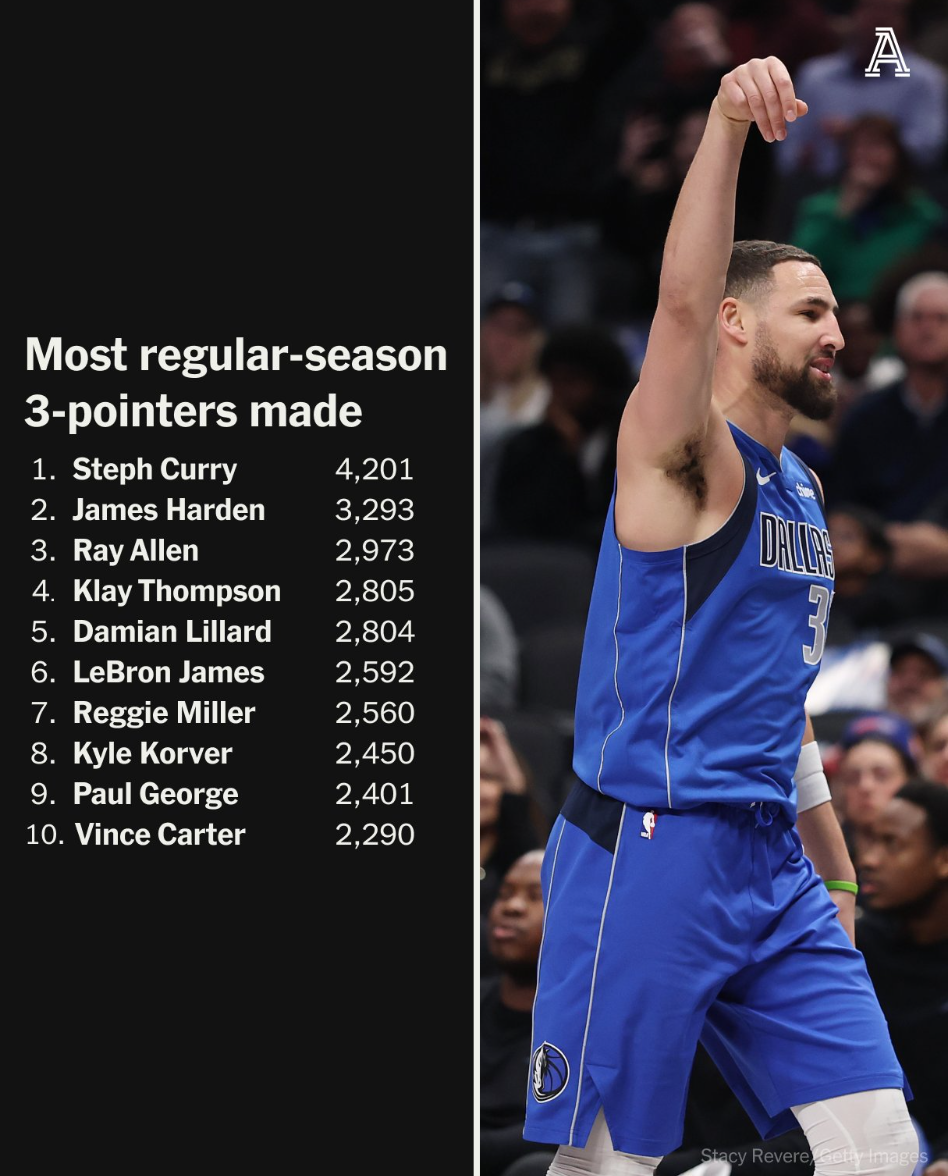北京时间1月16日,独行侠替补克莱-汤普森完成了职业生涯2805+三分超越达米安-利拉德升至历史第四位,在他身前只剩下库里、哈登、雷阿伦,而且这场比赛独行侠144-123狂胜爵士,克莱的里程碑之夜非常耀眼。