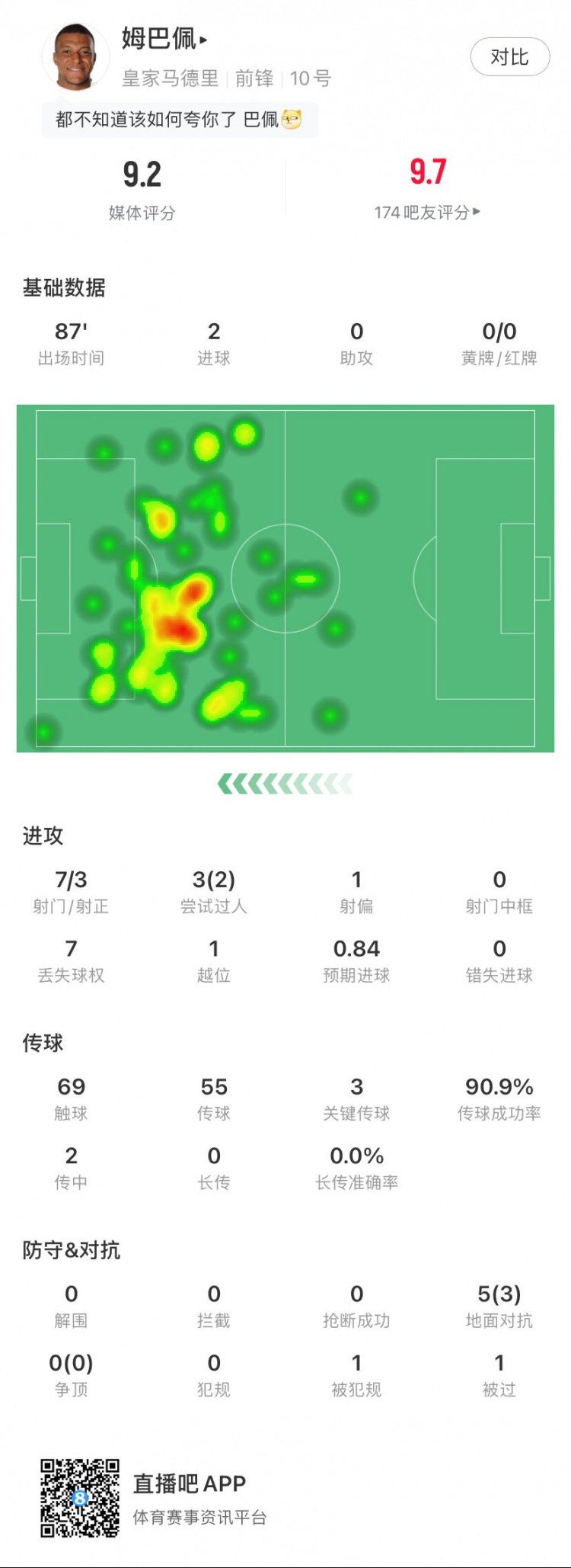 8月25日讯 西甲联赛第2轮,皇马客场对阵皇家奥维耶多。本场比赛皇马球员姆巴佩上演梅开二度,以下为他在本场数据: